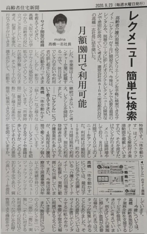 「高齢者住宅新聞」2020.09.23 第600号 に、弊社サービスの「レクシル」が掲載されました。